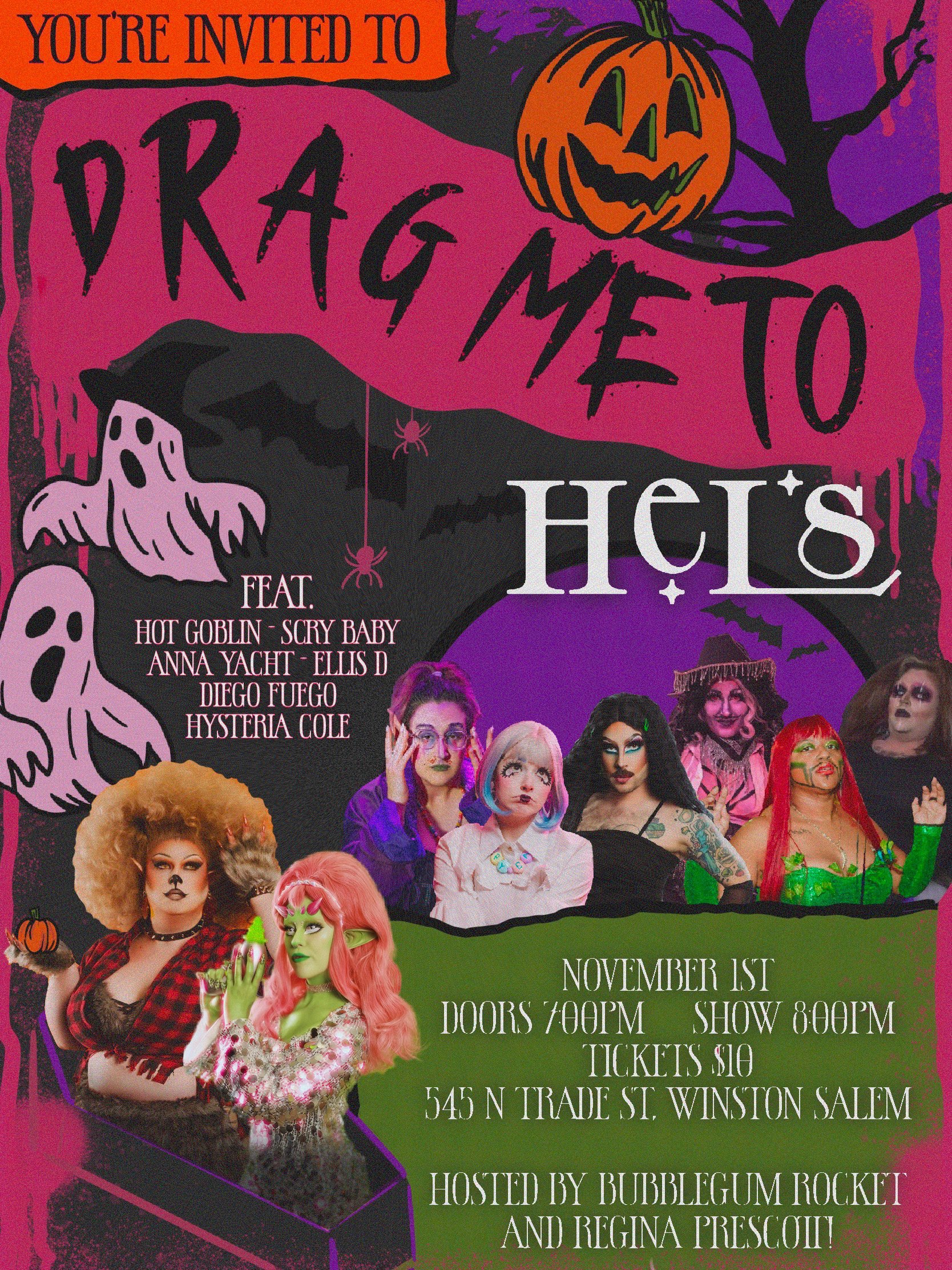 Hosted by Bubblegum Rocket and Regina Prescott, this unholy lineup features Hot Goblin, Scry Baby, Anna Yacht, Ellis D, Diego Fuego, and Hysteria Cole serving looks, laughs, and hellfire-level performances.